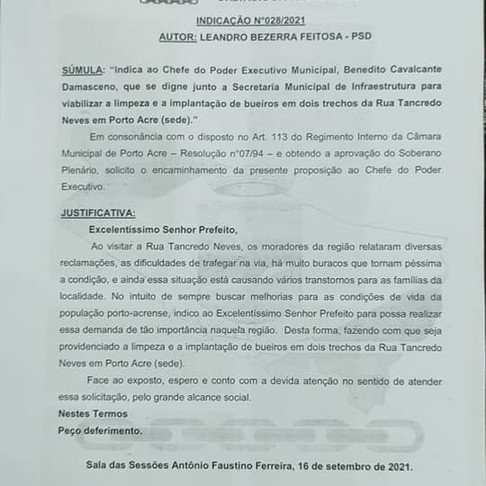 Na indicação nº 28/2021 o parlamentar requisitou que a Secretaria de Infraestrutura viabilizasse a limpeza e a implantação de bueiros em dois trecos da rua Tancredo Neves (Sede do município).